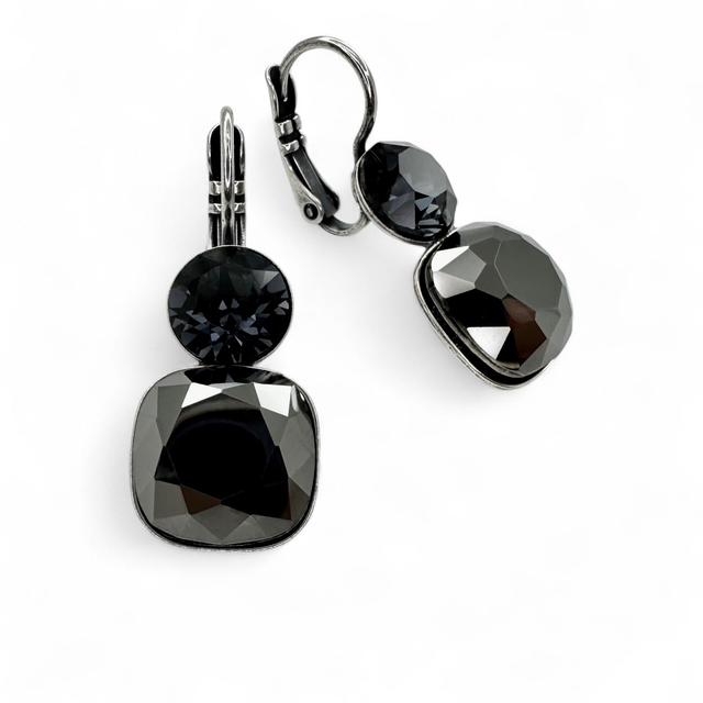 Ohrhänger DUO CUSHION 2 Glaskristalle 12 mm + 8 mm, Farbe Black Beauty, Schwarz, in versilberter Fassung, Gesamtlänge ca. 26 mm - Deva Design Schmuck ist nickelfrei - enjoy the beauty!